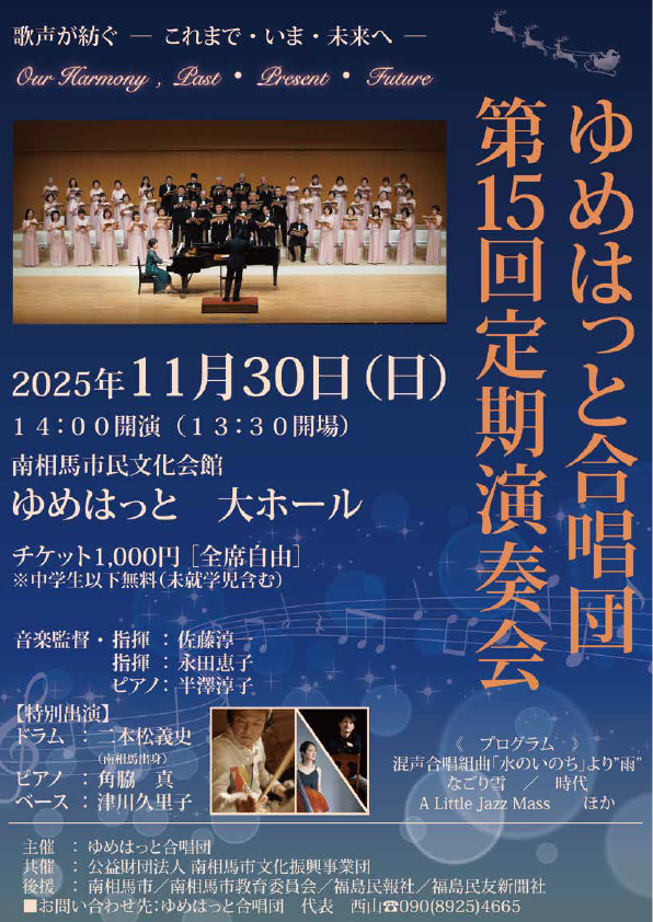 ゆめはっと合唱団の定期演奏会は、おかげさまで記念すべき15回目を迎えることができました。これまでの歩みを歌でたどる感動のステージ、さらにPOPSやJAZZなど多彩なプログラムで、華やかに彩ります。新しい魅力あふれるゆめはっと合唱団のステージを、どうぞお楽しみください!