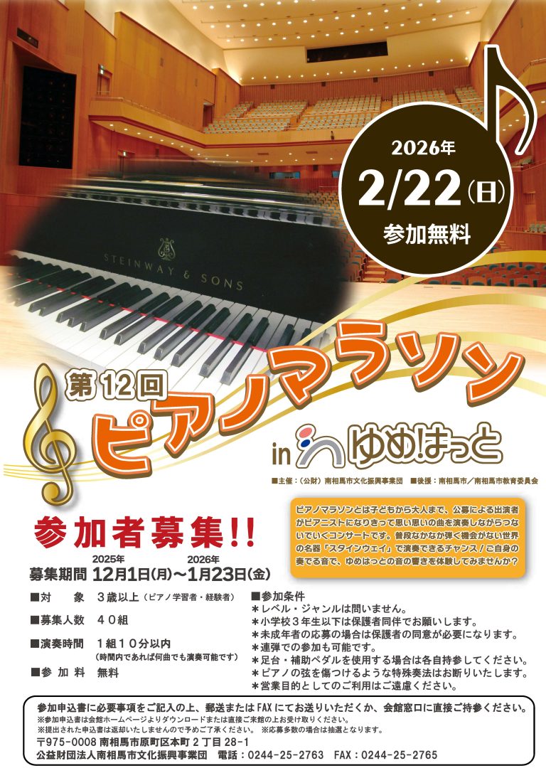 ピアノマラソンとは子どもから大人まで、公募による出演者が思い思いの曲を演奏しながら弾きつないでいくコンサートです。普段なかなか弾く機会がない世界の名器「スタインウェイ」で演奏していただき、音響特性に優れている大ホールの音の響きを体験していただきます。実力に関係なくピアノを始めたばかりの方でも大歓迎です!みなさまのご応募を心よりお待ちしております。